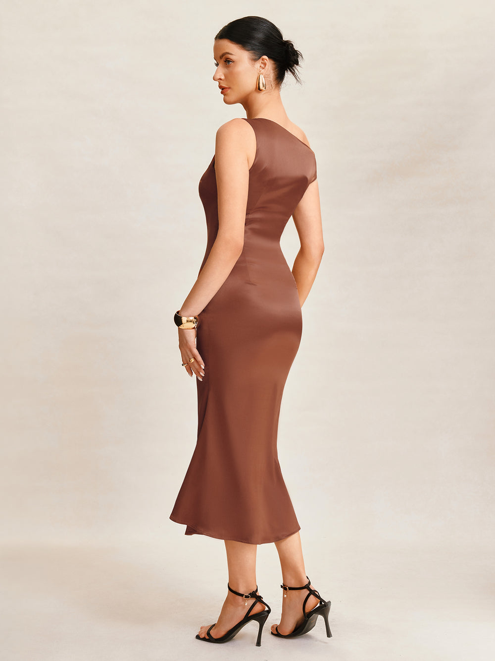 Mermaid Elegant Ruched Asymmetrical Neck Midi Women Dress